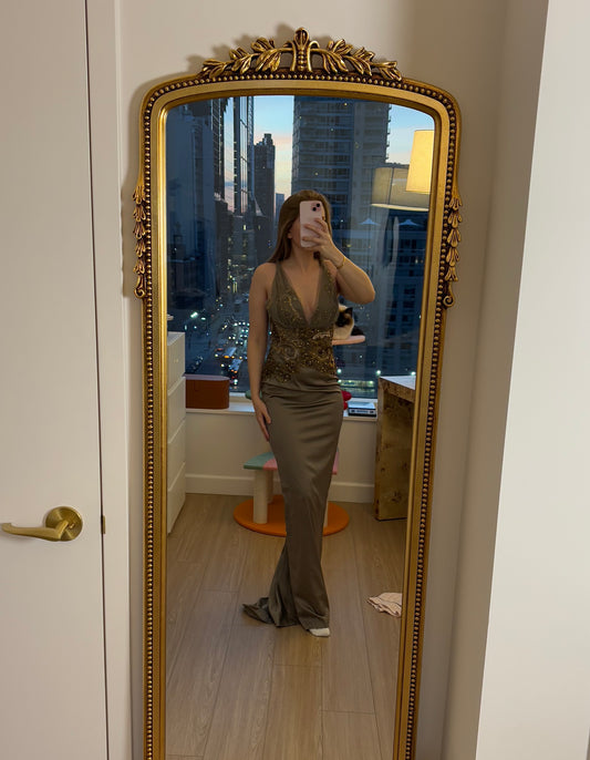 BADGLEY MISCHKA Vintage Floral Khaki Unique Evening Gown