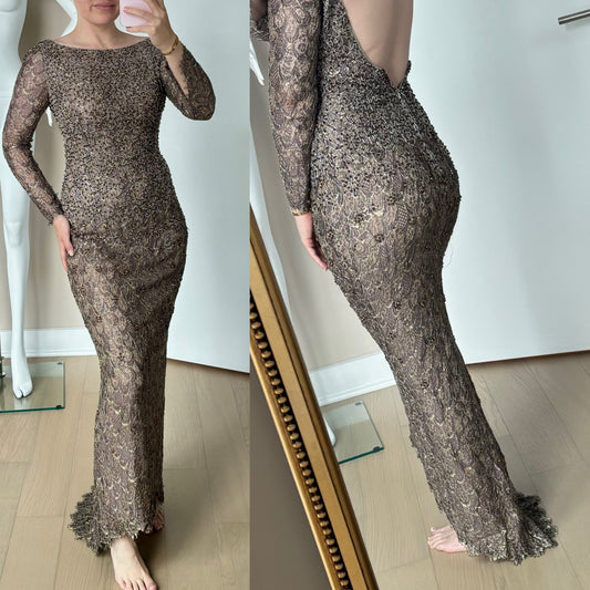BADGLEY MISCHKA 1990's Vintage Long Sleeve Heavily Beaded Evening Gown